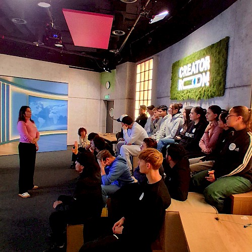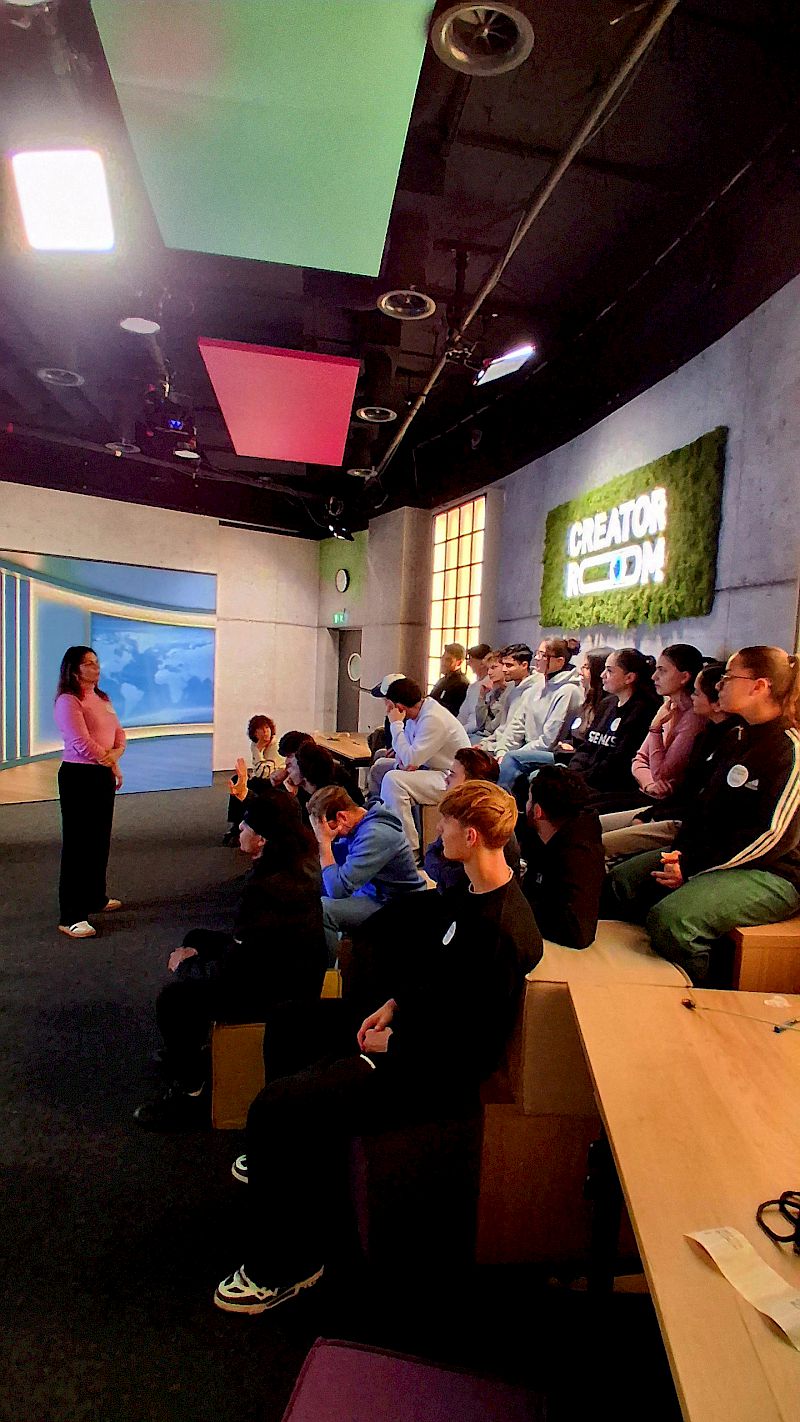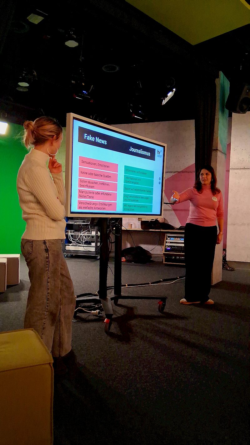 Dieses Ziel verfolgt auch der Hessische Rundfunk, der eigens zu diesem Zweck den CREATOR ROOM im Landesfunkhaus im Herzen von Frankfurt an den Start gebracht hat. Bereits vor einem guten Jahr wurde das Konzept an der JLS mit einer 12. Klasse der Fachoberschule erprobt. Unter der Anleitung von Sevilay Saatci, Medientrainerin, Medienpädagogin sowie Nachrichtensprecherin und Redakteurin beim Hessischen Rundfunk (u.a. HR-Info und YouFM) und der angehenden Theaterwissenschaftlerin Diana Dapa wurde am vergangenen Mittwoch eine neue Abschlussklasse der Fachoberschule an die Themen Fake-News, deren Entlarvung sowie die Grundlagen journalistischen Arbeitens herangeführt.