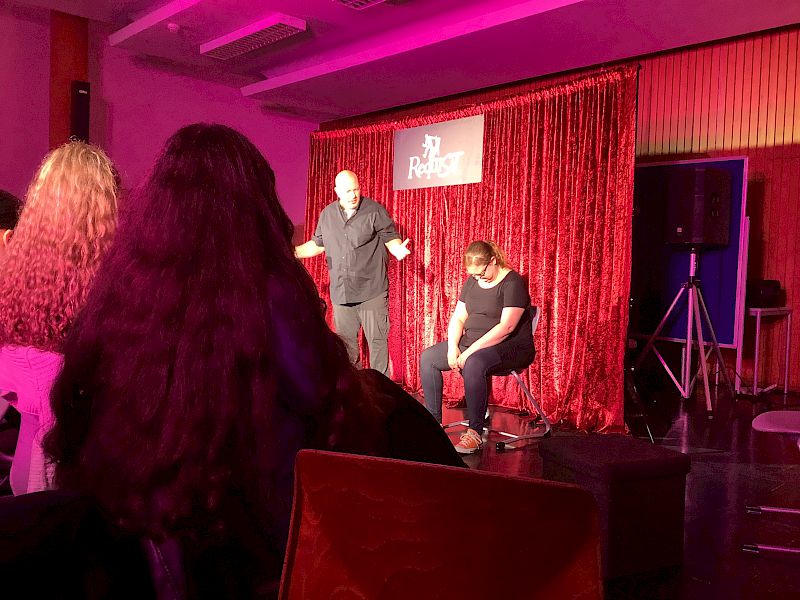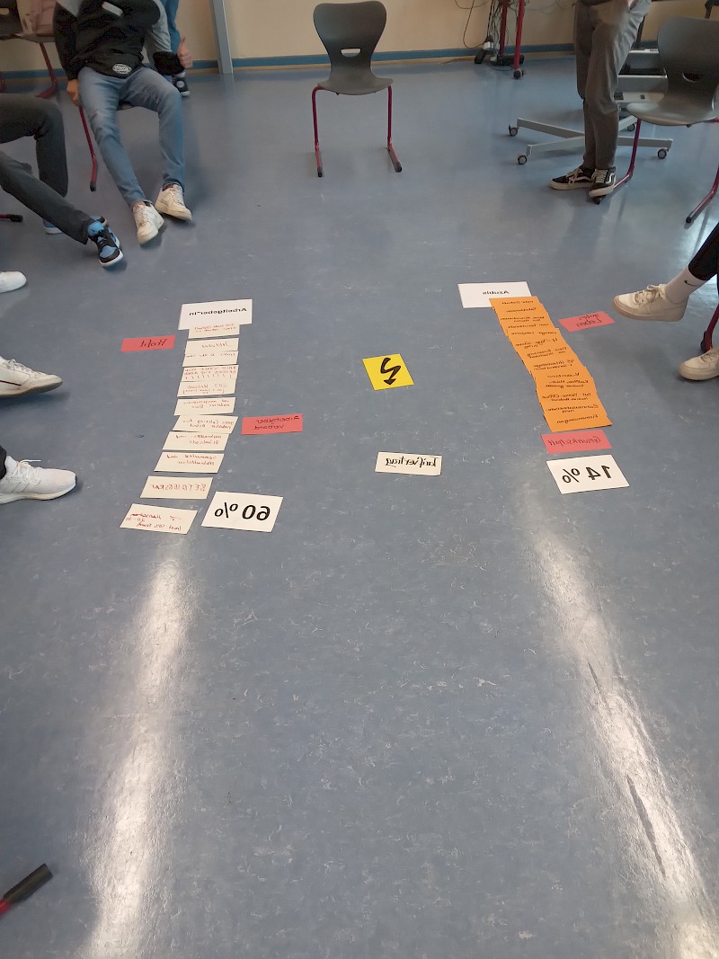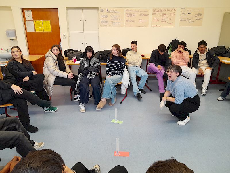 Diese Form des Theaters hat die Schülerinnen und Schüler aktiviert und gleichzeitig motiviert, ganz spontan auch selbst mal in die Rolle von Laiendarstellern zu schlüpfen. Die Perfomance auf der Bühne und die Regieideen des Publikums lockerten die Atmosphäre schnell auf. Diese Lockerheit wurde in der anschließenden Gruppenaustauschphase genutzt und die Schülerinnen und Schüler sowie die anwesenden Kolleginnen und Kollegen kamen zwanglos und ohne Hemmungen mit den Akteuren über ihre persönlichen Lebenswege ins Gespräch.