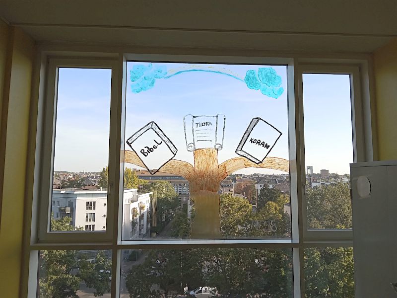 Die Religionsfachschaft hat dieses Fensterbild neu entworfen, das in seiner deutlichen Botschaft zeigt, dass Islam, Christentum und Judentum den gleichen Usprung, einen Stamm, haben. Gerade in der heutigen Zeit, in der interreligiöse Konflikte, wie seit dem Wochenende im Nahen Osten, zunehmen, ist solch eine Botschaft von unschätzbarem Wert.