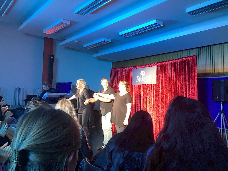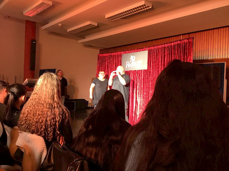 5, 4, 3, 2, 1, der Vorhang fällt und los gehts... das Improvisationstheater Requisit gastierte am vergangenen Donnerstag an der Julius-Leber-Schule. Und, wie der Name schon verrät, geht es spontan zu und das Drehbuch schreiben die Zuschauer sprichwörtlich auf Zuruf. Aber es geht um so viel mehr als theatralische Spontanität, hinter der Hattersheimer Truppe Requisit unter der Leitung der Diplom- und Theaterpädagogin Nora Staeger steht ein innovatives Konzept zur Suchtprävention. Sämtliche Darstellerinnen und Darsteller haben ihre ganz individuelle Suchtbiografie und stellen die Gefahren, die für uns alle von einer Suchterkrankung ausgehen, mit viel Spaß und gleichzeitig informierend dar.