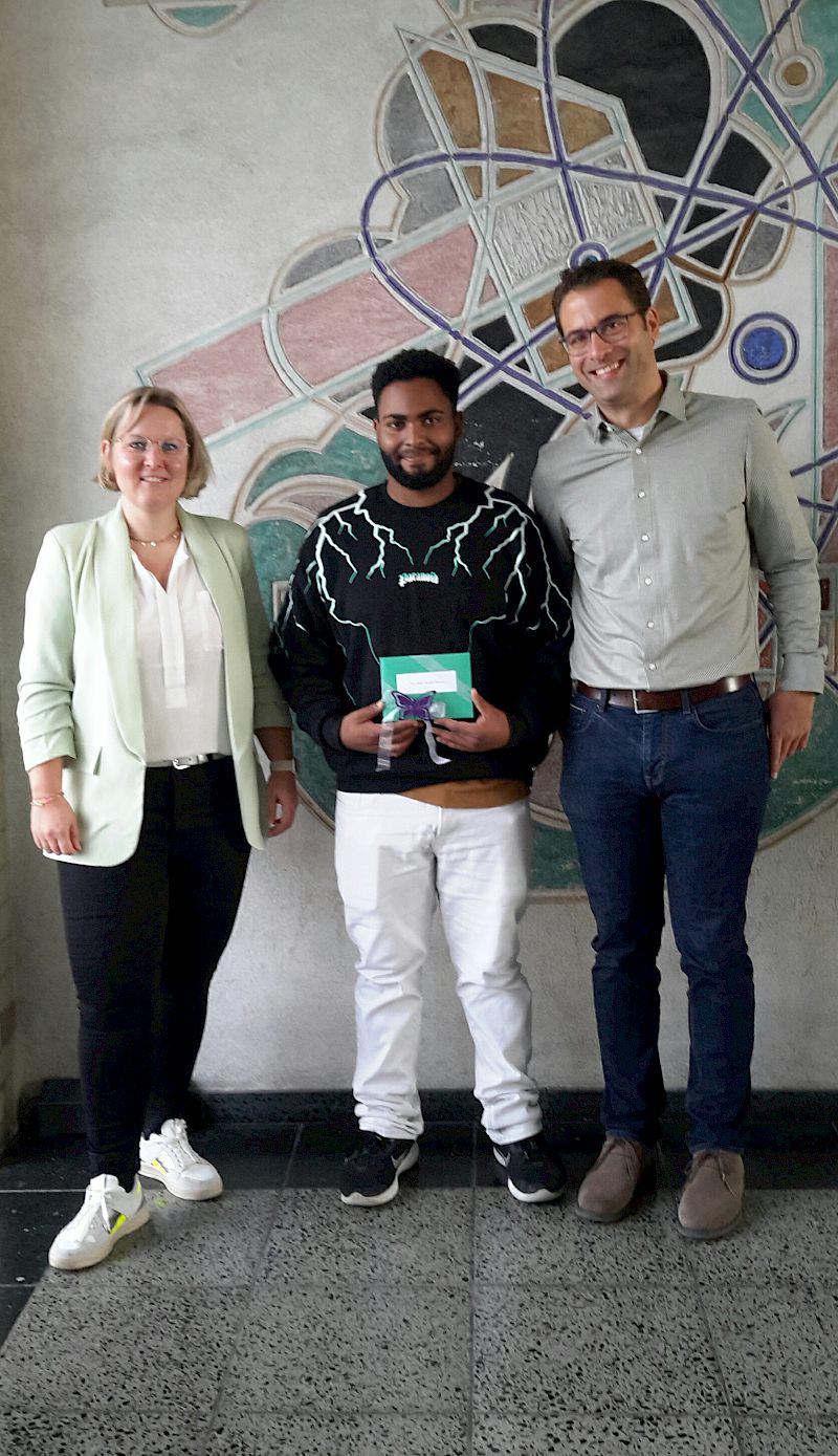 Seine Klassenlehrerin Frau Dix (links im Bild) und Abteilungsleiter Herr Stiefelhagen (rechts im Bild) bedankten sich im Namen der ganzen Schulgemeinde bei Fady-Hadi Sheikh-Hasan.