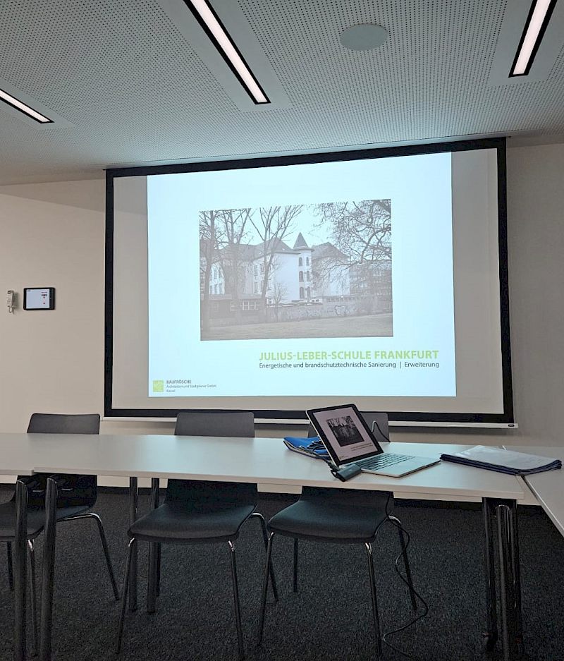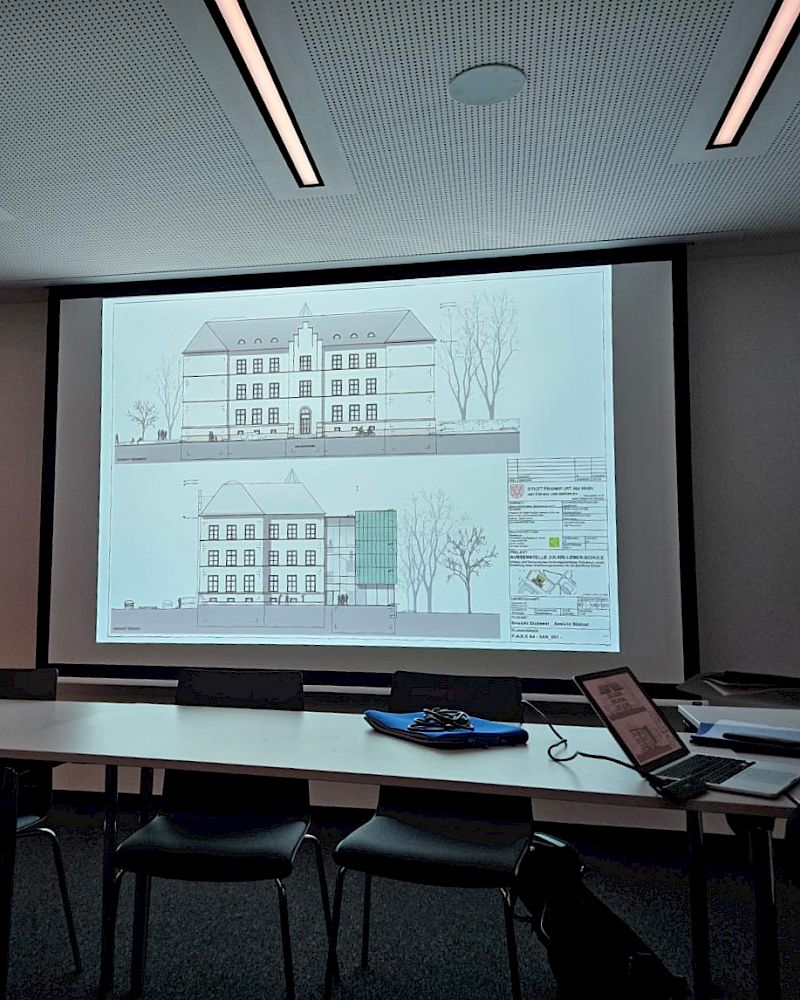 Zukünftig soll das Gebäude wieder seiner eigentlichen Bestimmung übergeben werden, als Außenstelle unserer Schule. Zur Information über die geplanten Sanierungs- und Umbauarbeiten trafen sich in den Räumlichkeiten des Amts für Bau und Immobilien (ABI) ein gutes Dutzend interessierte Kolleg:innen der JLS am vergangenen Montag mit den Projektverantwortlichen des ABI und vor allem mit einem Geschäftsführer des ausführenden Architekturbüros „Die Baufrösche“, welches den Wettbewerb für die Gestaltung des Umbaus für sich entschieden hatte. Dieser liegt schon eine geraume Zeit zurück, seit 2014 liegen die Pläne in der Schublade, jetzt wurden (endlich) die öffentlichen Gelder bewilligt und die Ausschreibungen der einzelnen Gewerke können beginnen.