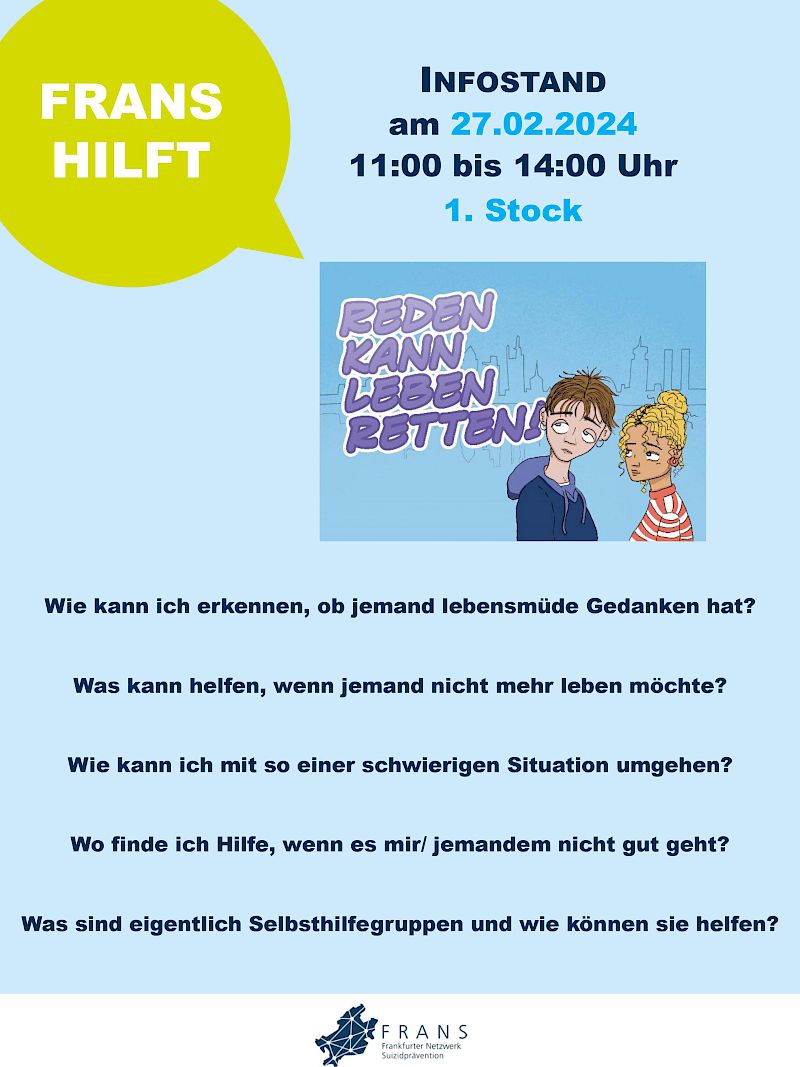 Gerade die Themen, die man im Alltag gerne verdrängt und die wenig Raum erhalten, benötigen eine ganz besondere Aufmerksamkeit. Das Thema Suizid ist ein solches und das Frankfurter Netzwerk für Suizidprävention, kurz FRANS, hat es sich zur Aufgabe gemacht, damit ganz offen umzugehen.