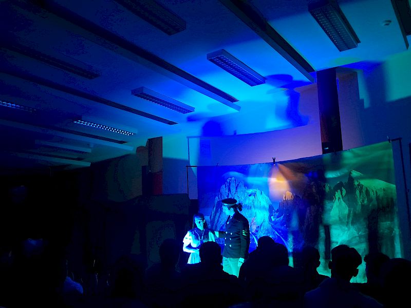 Daniela Mitterlehner (Marie, Doktor) und Valentin Eckert (Woyzeck), die für die Inszenierung verantwortlich zeichneten, sowie Christian Katzorke, der Hauptmann und Tambourmajor verkörperte, brachten den SchülerInnen der Jahrgangsstufe 12 das Dramenfragment von Georg Büchner gleichsam unterhaltsam und lehrreich näher. Dafür brauchte es keine großen Effekte, ein einfaches Bühnenbild, puristisch gehaltene Requisiten und gezielte Licht- und Audioeffekte, all dies unterstrich die große schauspielerische Leistung, die die Charakteristik der Figuren in den Mittelpunkt stellte. Zudem wurden zwei Enden präsentiert, in der Originalfassung ist es schließlich nicht der Tambourmajor, sondern Woyzeck, der Marie zum Schluss des Stückes ersticht.