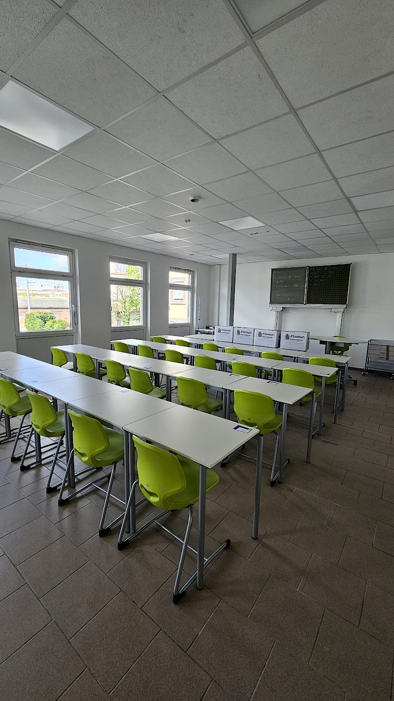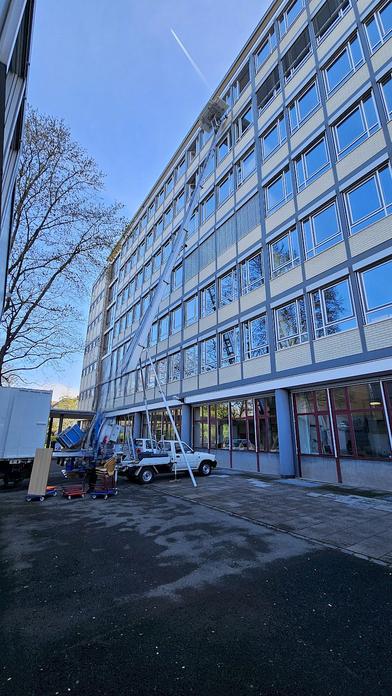 Herzlich willkommen! So hätte es heißen sollen, als wir und die ersten Schülerinnen und Schüler am 15.04.2024 den Schulhof der dezentral gelegenen Interimsaußenstelle in Alt-Fechenheim betraten und mit dem Unterricht starten wollten. Vorzufinden war allerdings ein Schulhof mit reger Bau- und Umzugstätigkeit, denn die Herrichtung des Gebäudes war und ist auch heute noch in vollem Gang und der Einzug damit stark ausgebremst. Die Räumlichkeiten konnten erkundetet und erste Kisten ausgepackt werden. In der ersten Woche konnte nur unter erheblichen Einschränkungen unterrichtet und die Zeit im Gebäude verbracht werden. Der eigentlich für die uns und die Schülerinnen und Schüler gewohnte digitale Unterricht musste wegen fehlender PC-Anschlüsse, fehlender Beamer sowie fehlendem WLAN auf Arbeitsblätter umgestellt werden, deren Vervielfältigung sich als schwierig herausstellte, da auch die gelieferten Kopierer nicht angeschlossen werden konnten. Kabel hingen in vielen Räumen und im Treppenhaus von den Decken, die Küche im Lehrerzimmer ist wegen fehlender Wasseranschlüsse auch heute noch nicht nutzbar, Unterrichtsräume sind aufgrund defekter Heizungsanlagen überhitzt oder stark ausgekühlt. Wir beschulen unsere Schülerinnen und Schüler gefühlt „Hand in Hand“ mit den ausführenden Unternehmen, die nach wie vor an der Fertigstellung der Gewerke arbeiten. Darüber hinaus sind das Sekretariat und die Räume der Schulleitung sowie einige Klassenräume noch nicht nutzbar.