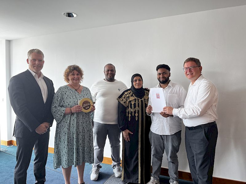 SV-Julius-Leber-Schule (auf dem Bild v.l.n.r.: SV-Verbindungslehrerin H. Ghiliu, Özge Karabulut, Yannick Schürdt, Pauline Hengesbach, SV-Verbindungslehrer N. Samman