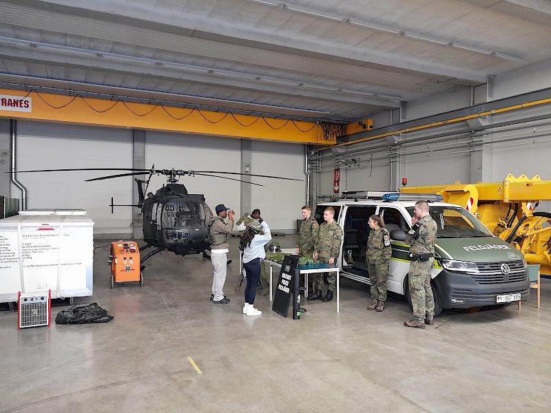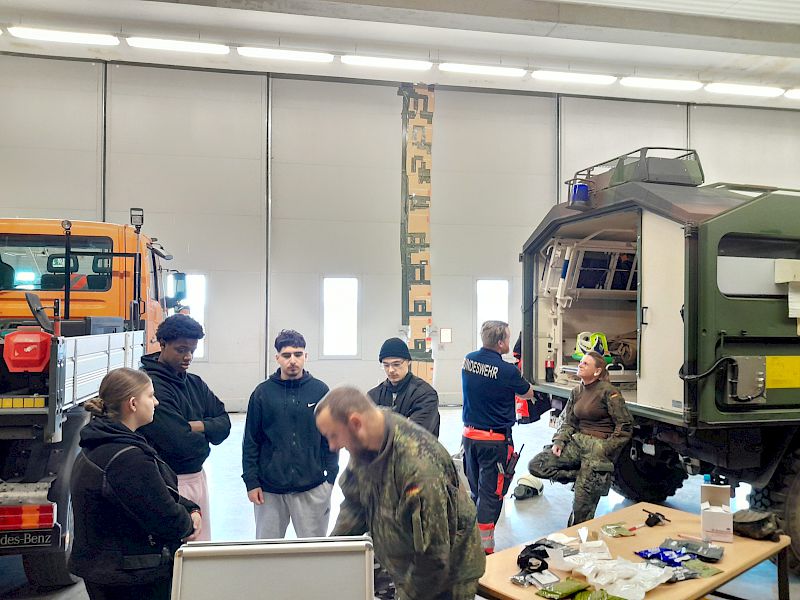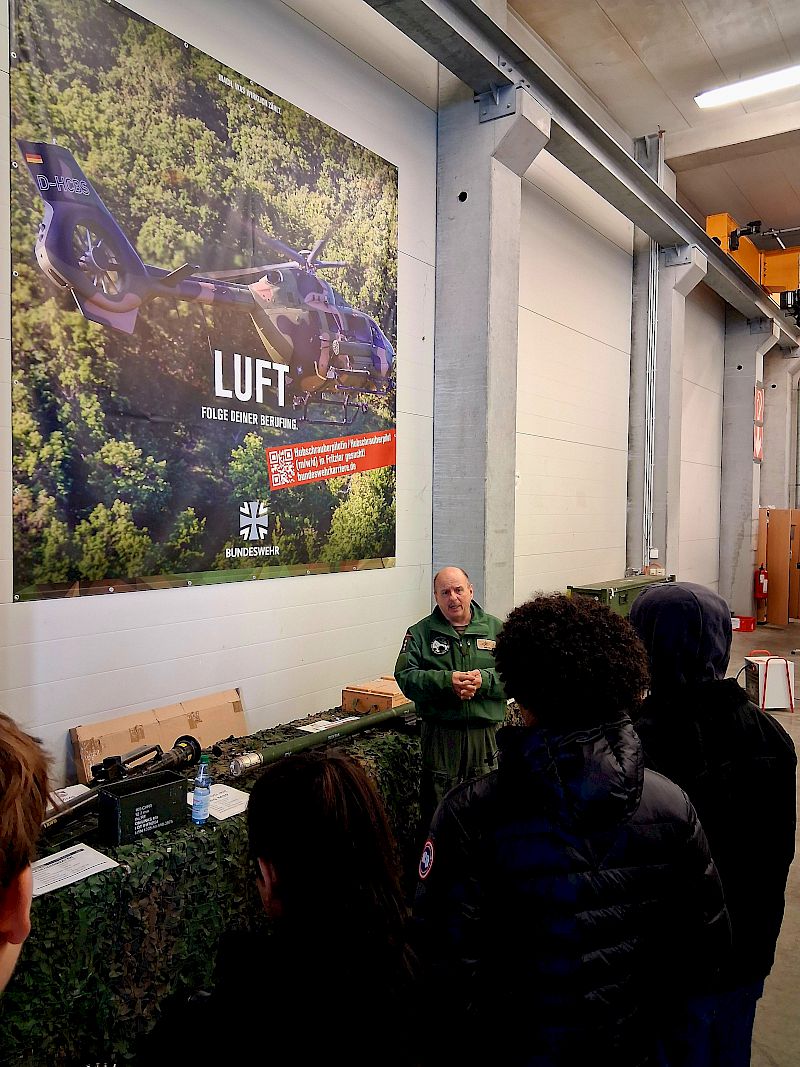 Nach einem anschaulichen Streifzug durch die Geschichte der Kaserne, konnten sich die Schülerinnen und Schüler an verschiedenen Stationen (Feldjäger, Sanitätscorps, Kampfhubschraubermuster) über die beruflichen Perspektiven, die die Bundeswehr bietet, informieren. Alle Fragen wurden von erfahrenen Soldatinnen und Soldaten beantwortet. Darüber hinaus standen zwei Karriereberater der Bundeswehr den Schülerinnen und Schüler jederzeit für Einzelgespräche zu Verfügung. Dieses Angebot wurde reichlich genutzt und die Gelegenheit zur Information aus erster Hand vielfältig wahrgenommen.