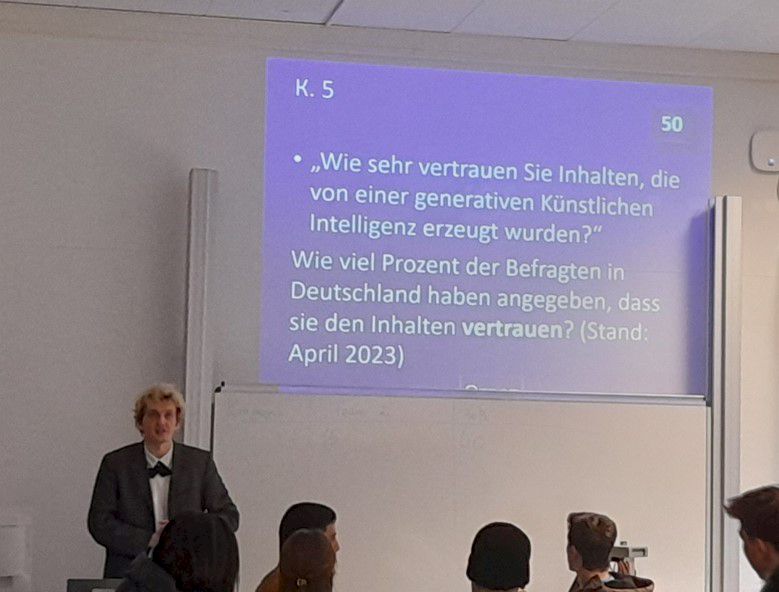 Anhand von persönlichen Erfahrungsberichten der Schülerinnen und Schüler, angereichert um Studienergebnisse aus dem Bereich Jugend, Information und Medien sowie praktischen Übungen zur Einschätzung von wahren / unwahren Nachrichten und KI-generierten Bildern wurde die Klasse lebensweltorientiert und motivierend an das Thema herangeführt und das bereits vorhandene Wissen um wesentliche Punkte, genannt sei hier nur der Datenschutz und die gebotene Vorsicht bzgl. des Teilens von Information im digitalen Raum, erweitert.