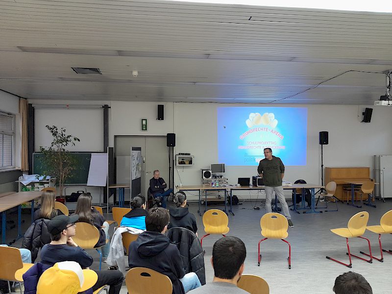 Um diesen hohen Anspruch gerecht zu werden, ist es der JLS gelungen, den Journalisten Marcus Kiesel und den ehemaligen DDR-Spitzenturner Wolfgang Thüne (u.a. Bronzemedaillengewinner bei den Olympischen Spielen 1972 in München) vom Verein „die politiksprecher“ mit ihrer Grundrechte-Arena für eine zweitätige Veranstaltungsreihe an die Schule zu holen. Die jeweils 90-minütigen interaktiven Vorträge thematisierten dabei nicht nur die Artikel 1-5 des Grundgesetzes, sondern integrierten die Schülerinnen und Schüler explizit in den Ablauf, indem mittels lebensnaher Beispiele die Bedeutung von Meinungsfreiheit, aber auch die Grenzen dieser, sowohl moralisch als auch rechtlich, veranschaulicht wurden.