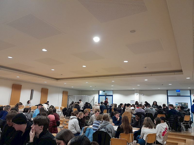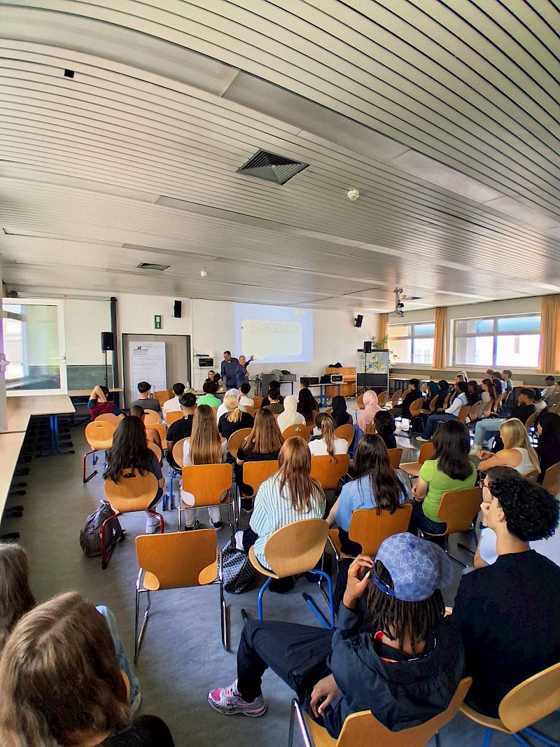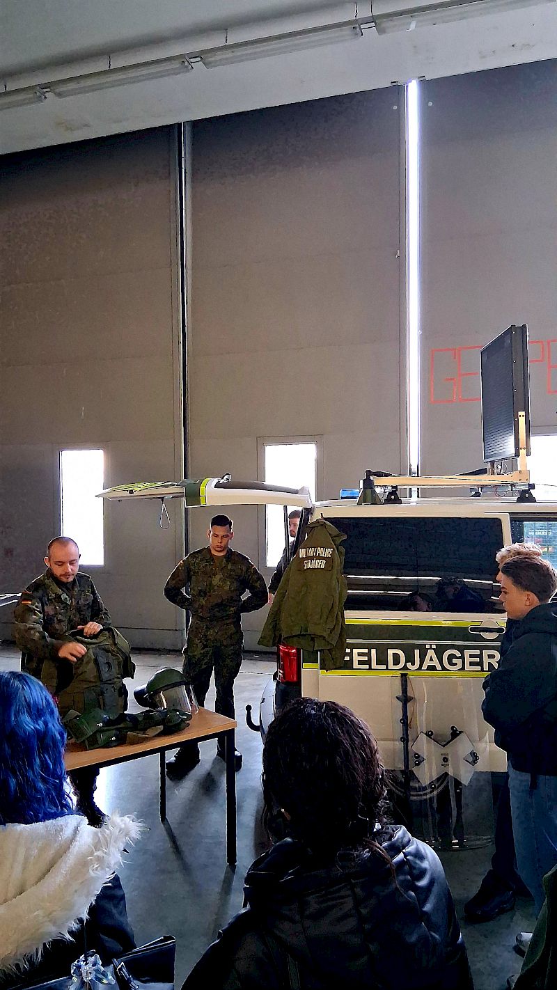 Neben den Aufträgen der Bundeswehr, den Herausforderungen in der Folge des Russland-Ukraine-Krieges wurde auch der, seit dem 07. Oktober 2023 wieder aufgeflammte, Nahost-Konflikt thematisiert. Es gab keine Frage, die nicht gestellt werden konnte. Ausgewogen, wertschätzend und auf Augenhöhe wurden sämtliche Fragen zu diesem unbeschreiblich schwierigen und bedrückenden Thema beantwortet. Als Beleg sei hier auf die Anzahl der Schülerinnen und Schüler verwiesen, die nach der Veranstaltung das Angebot nutzten, um über den Vortrag hinaus mit Herr Olt. May ins Gespräch zu kommen.