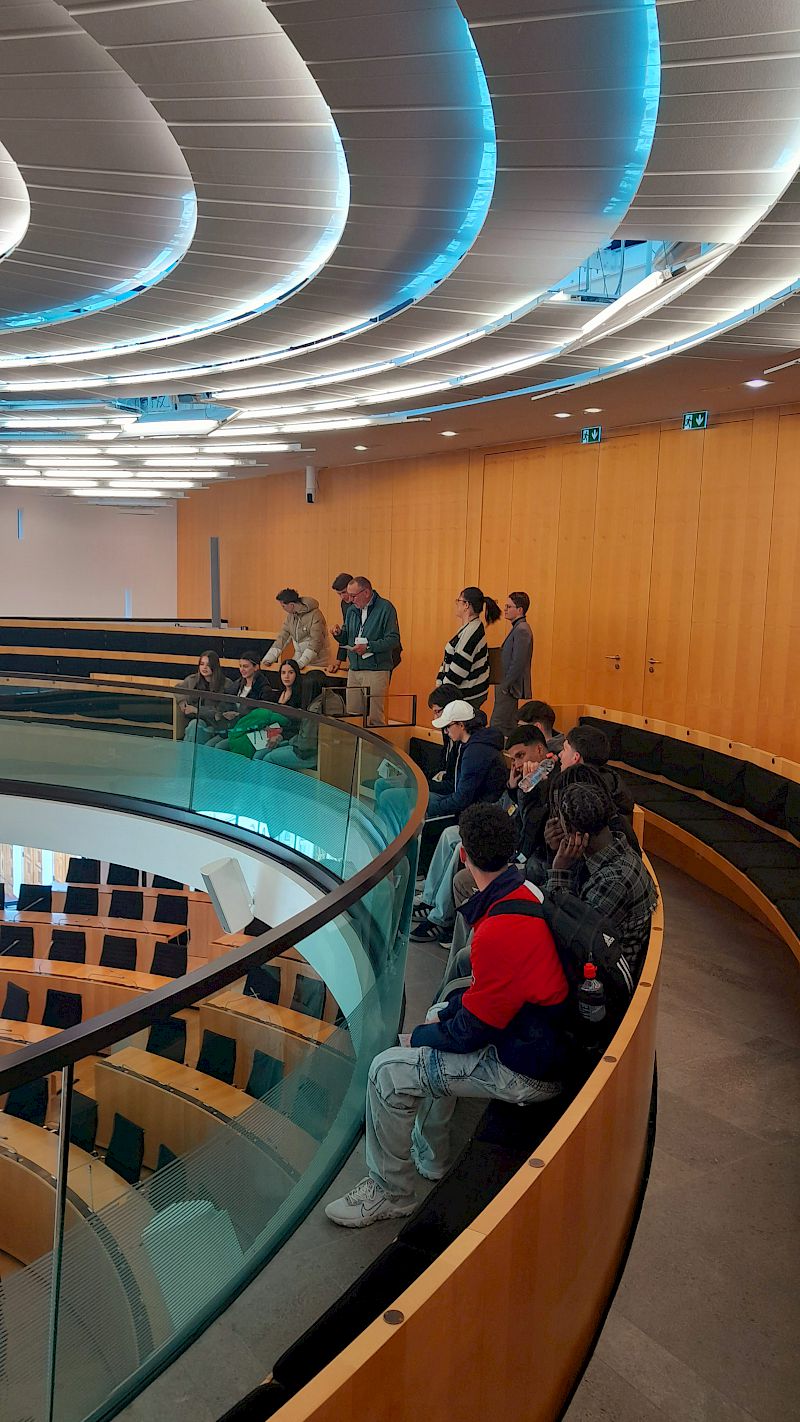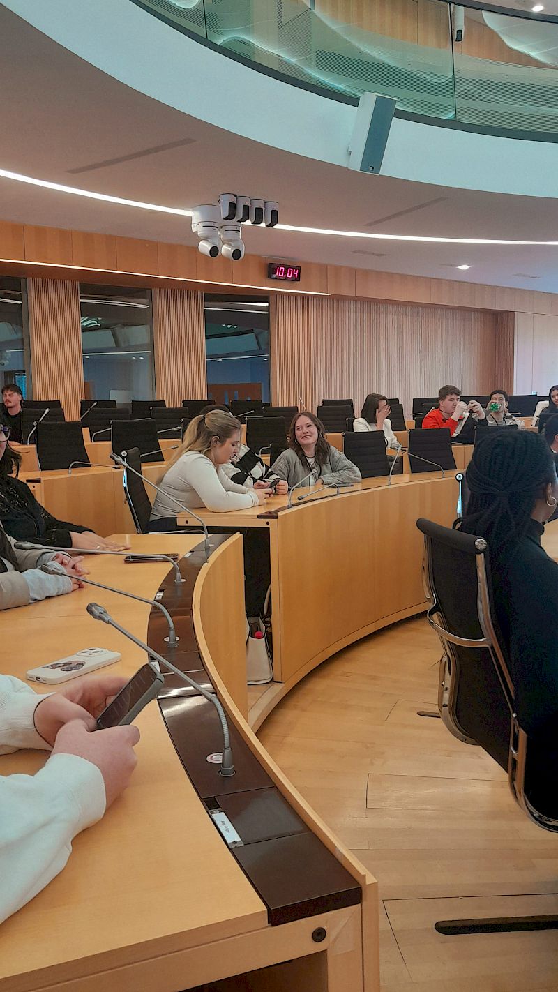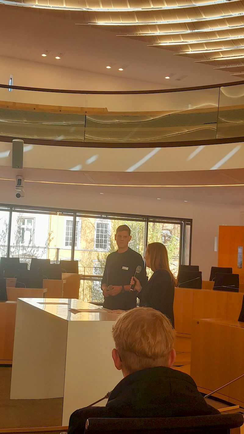 Die Schülerinnen und Schüler verbrachten einen Unterrichtstag der ganz besonderen Art u.a. im Plenarsaal des Hessischen Landtags sowie in den zugehörigen Räumlichkeiten, der ganz im Zeichen der Sensibilisierung gegen Antisemitismus und Diskrimierung stand. Die gleichsame Demut und der Respekt vor den zu behandelnden Inhalten und der Institution Hessischer Landtag waren dabei stetige Begleiter.