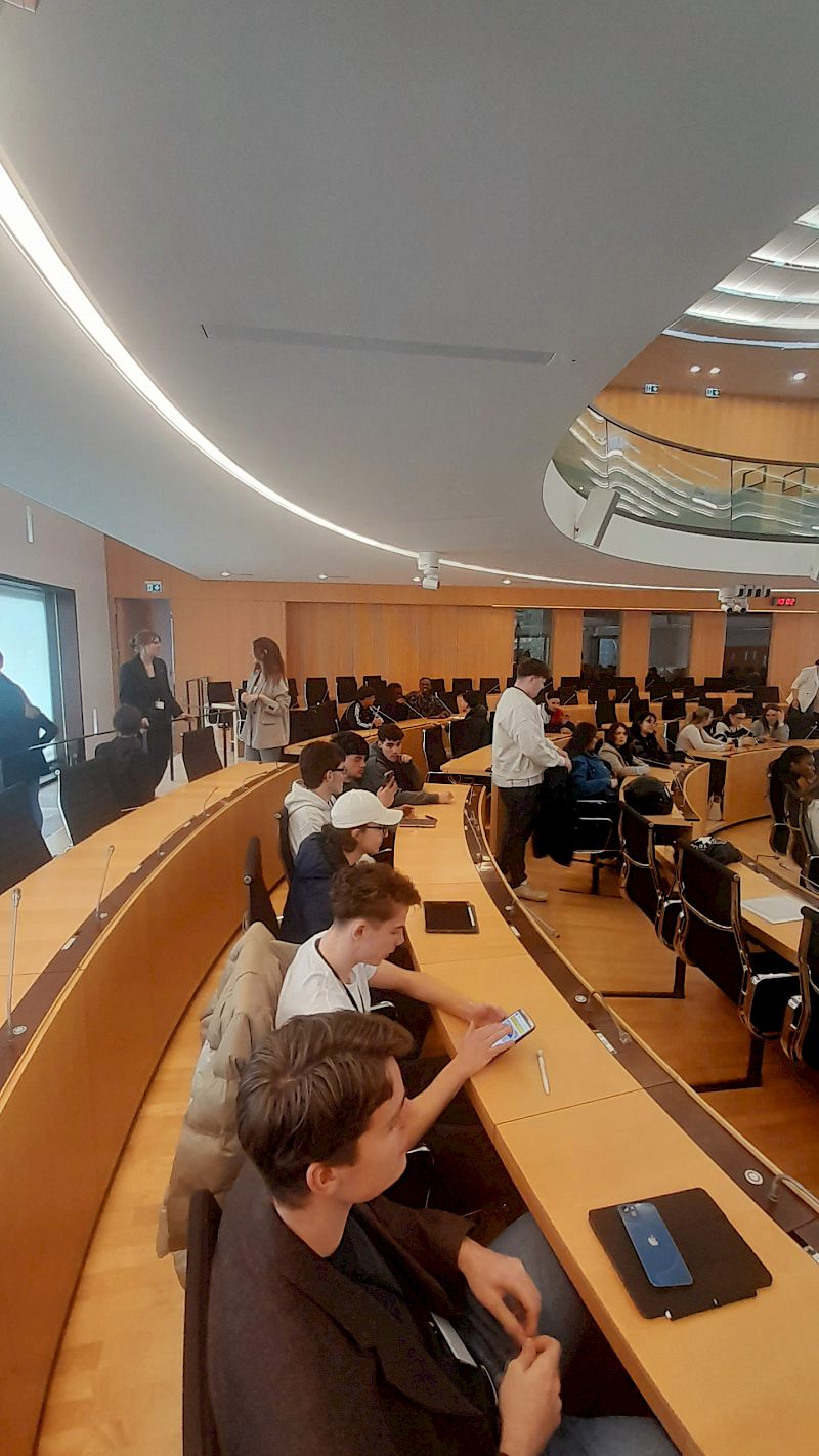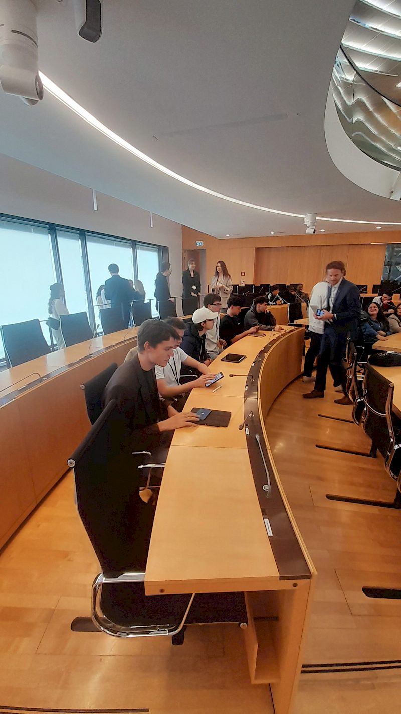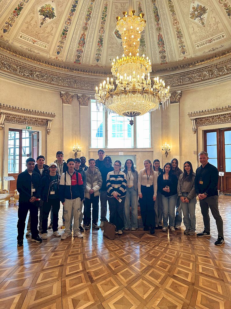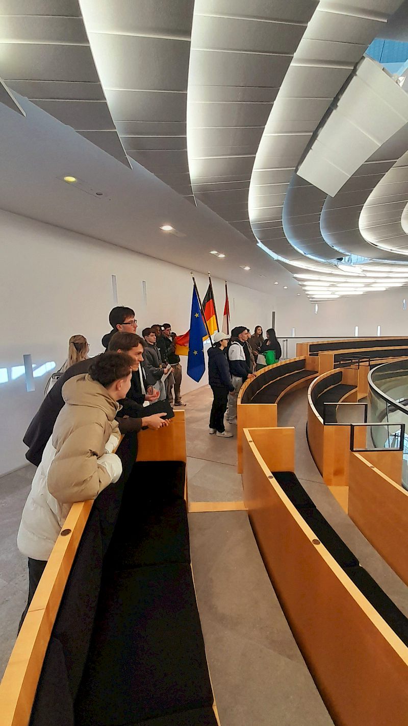 Die Schülerinnen und Schüler verbrachten einen Unterrichtstag der ganz besonderen Art u.a. im Plenarsaal des Hessischen Landtags sowie in den zugehörigen Räumlichkeiten, der ganz im Zeichen der Sensibilisierung gegen Antisemitismus und Diskrimierung stand. Die gleichsame Demut und der Respekt vor den zu behandelnden Inhalten und der Institution Hessischer Landtag waren dabei stetige Begleiter.