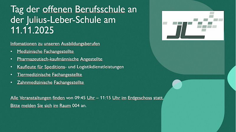 Am 14.11.2023 informieren wir an der Julius-Leber-Schule zu unseren Schwerpunktformen in der Fachoberschule und zu unserer Ausbildungsberufen.