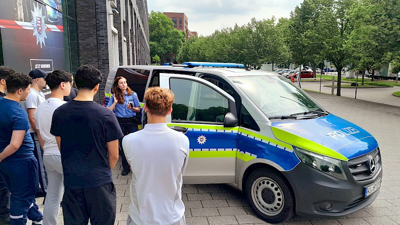 Alle Fragen wurden beantwortet und die Schüler bekamen einen ersten kleinen, aber sehr detailreichen Einblick in den Berufsalltag sowie die Einstellungsvoraussetzungen der Hessischen Polizei. Es wurde u.a. das Einsatzequipment und ein Einsatzfahrzeug besichtigt, bei der anschließenden Führung durch das Zentrale Polizeigewahrsam wurde es merklich still, zu interessant, informativ und berührend zugleich waren die Eindrücke.
