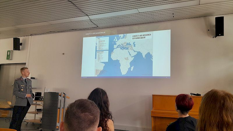 Eben diese Perspektive, nämlich die Perspektive der Bundeswehr, nahmen am vergangenen Donnerstag drei Abschlussklassen der 12. Jahrgangsstufe der Fachoberschule ein, die dem Vortrag des Jugendoffiziers Frankfurt am Main der Bundeswehr, Herr Olt. May, zur politischen Bildung mit großem Interesse folgten.