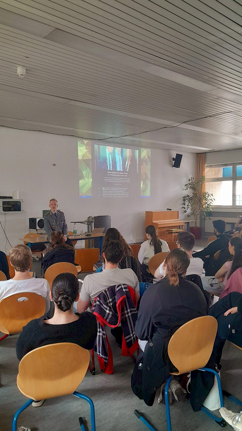 Dass diese Veranstaltung einen wichtigen Beitrag zur politischen Bildung darstellt, zeigte sich neben der regen Beteiligung der Schülerinnen und Schüler vor allem daran, dass viele von ihnen direkt im Anschluss die Gelegenheit nutzten, um mit dem Jugendoffizier direkt ins Gespräch zu kommen.